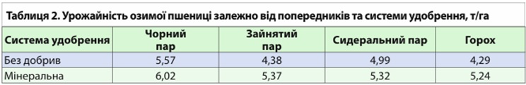 За використання мінеральних добрив сидеральний пар був на рівні зайнятого пару та поступався чорному пару за одержаним врожаєм озимої пшениці на 11,6% (таблиця 2).