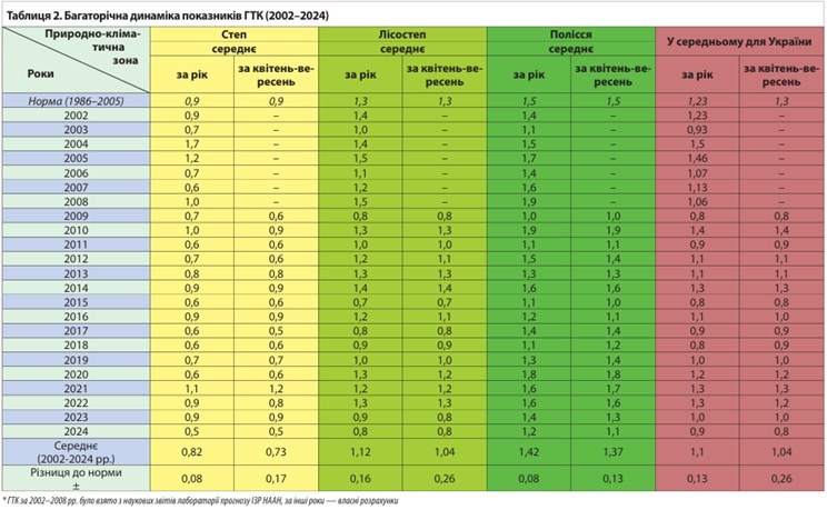 Якщо розглядати загалом по Україні, то ГТК мало б становити 1,3, але за період 2002-2024 рр. воно опустилося до 1,1. За аналізу ГТК безпосередньо за період активної вегетації (квітень-вересень) зазначених років і подальшому його порівнянні з середнім багаторічним –тенденція до зменшення (табл. 2). Проте різниця була значно більшою, ніж за аналогічного порівняння показників ГТК року, зі зниженням значень у північному напрямку, що свідчить про кардинальнішу зміну погодних умов саме у період вегетації.