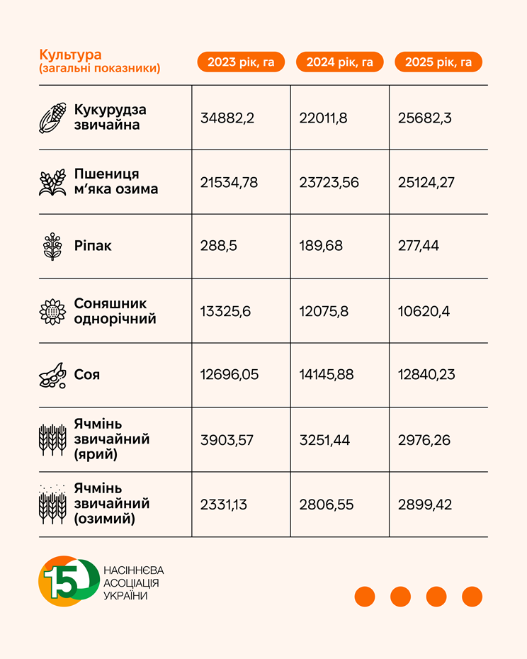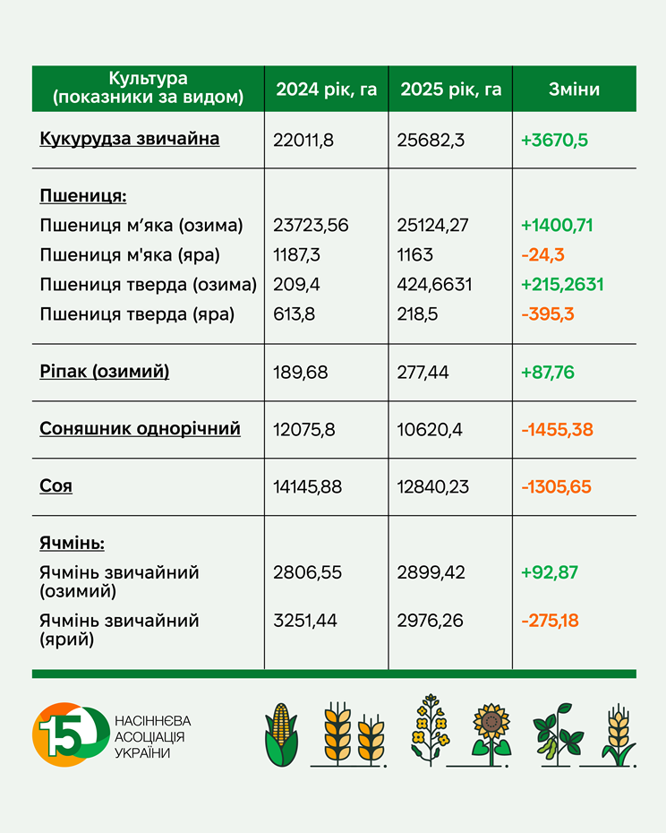 У 2025 році в Україні зафіксовано збільшення насіннєвих площ під основними сільськогосподарськими культурами, як порівняти з 2024 роком. Йдеться про пшеницю, кукурудзу, ріпак, соняшник, сою та ячмінь.