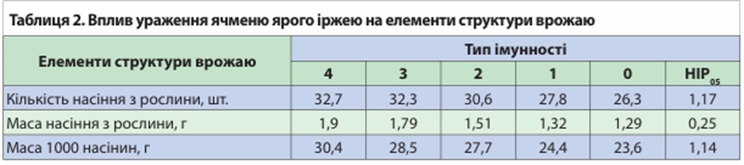 Коефіцієнт кореляції рівний (r = 0,969). Зниження довжини колоса ячменю ярого залежно від бала ураження іржею виражено в рівнянні регресії Y = 0,375X + 3,66. Ураження рослин іржею значно впливало на елементи структури врожаю (табл. 2).