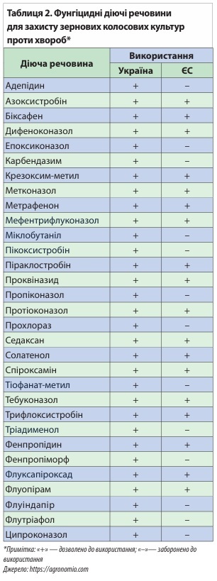 У таблиці 2 наведено порівняльну інформацію найпоширеніших діючих речовин, які застосовують для захисту посівів зернових колосових культур проти хвороб листя та колоса, з погляду дозволеності використання в Україні та Європейському Союзі.