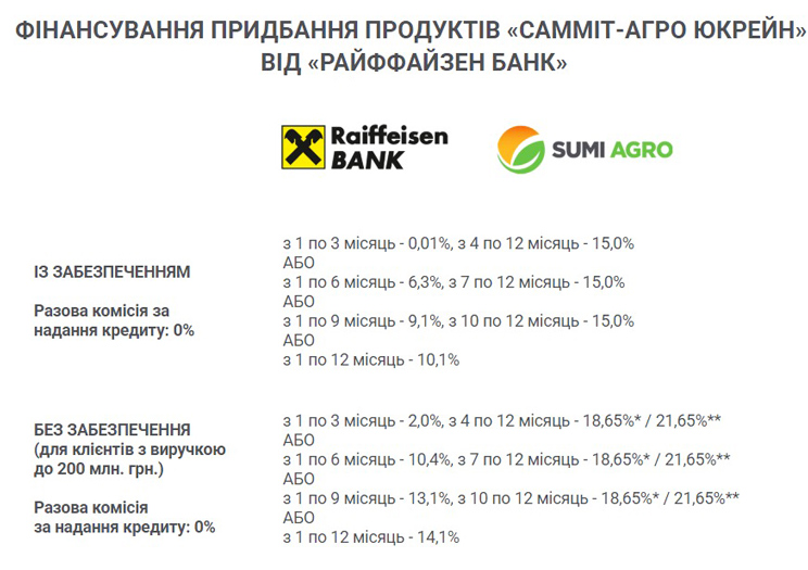 Головна особливість механізму підтримки з Райффайзен Банком — гнучкість умов фінансування залежно від структури забезпечення та фінансових показників підприємства.