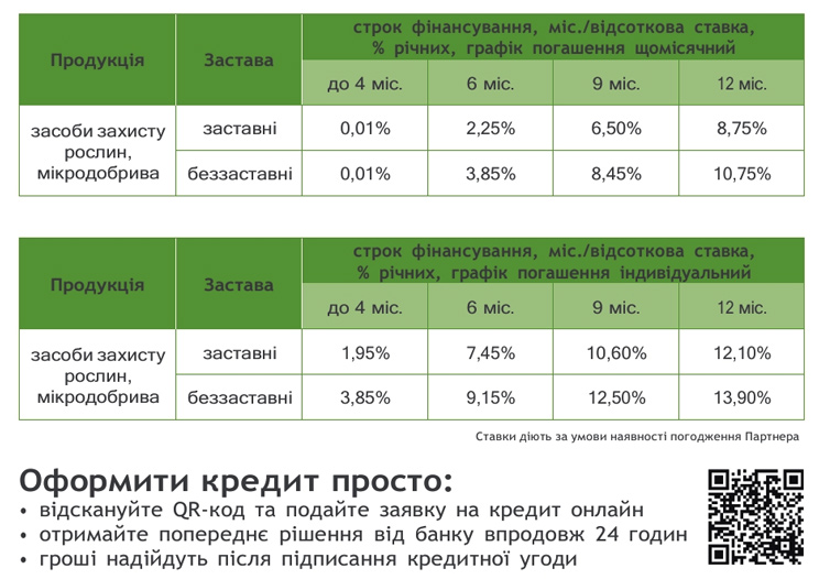 NB: У межах партнерських програм із банками, зокрема із Райффайзен Банк та Креді Агріколь Банк, аграрії можуть оформити авальований вексель під 1% комісії з відстрочкою платежу до дев’яти місяців у гривні. Мінімальна сума фінансування становить від 400 тис. гривень, а забезпеченням можуть бути різні види ліквідного майна — техніка, обладнання, транспорт, нерухомість або майнові права на депозит. Водночас програма передбачає відсутність комісії за встановлення ліміту, а фіксація ціни в гривні дозволяє уникнути ризиків валютних коливань та інфляції упродовж сезону.