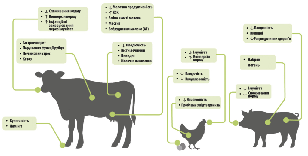 Як наслідок, тварини, що зазнали впливу мікотоксинів, часто проявляють не дуже помітні й досить неспецифічні симптоми: зниження приростів, зниження ефективності годівлі, продуктивності (виробництва яєць та молока), а також різні репродуктивні розлади, що ускладнюють діагностику й потребують надзвичайної пильності з боку виробників сільськогосподарської продукції (рис. 1).