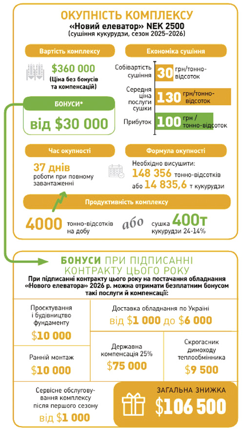 Як свідчить досвід, у вологий рік комплекс NEK 2500 від «Нового Елеватора» здатен за умови повного завантаження окупитися за 37 діб! Важко знайти інше обладнання, інвестиції у яке окупаються за один сезон. Тож якщо аграрій ще й сушитиме зерно для сусідів, кошти за цю послугу вже будуть чистим прибутком.