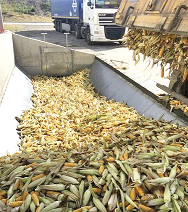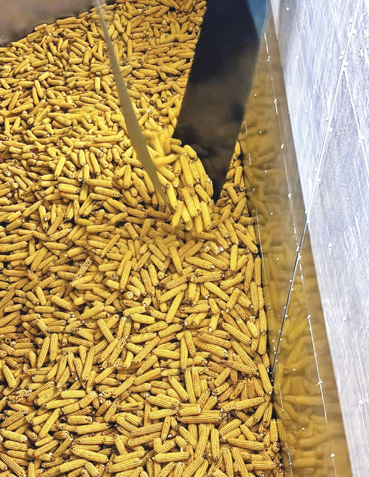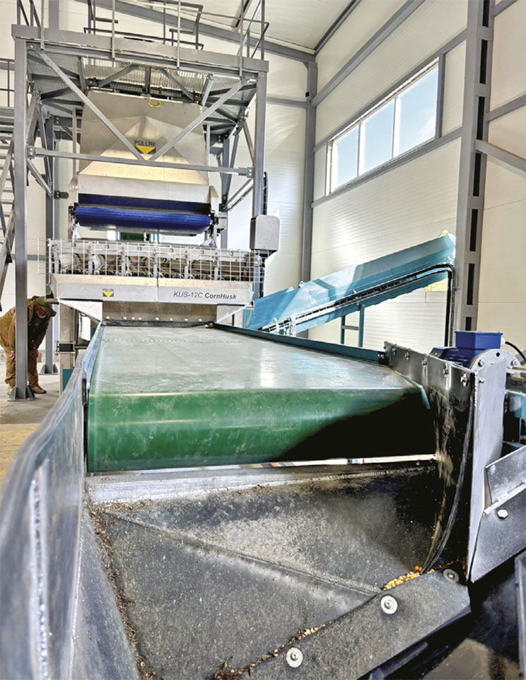 Відтак після збирання качани кукурудзи надходять на приймальний комплекс. Тут першим етапом є завальний бункер для автоприймання, який може мати різний обсяг (у середньому 40–50 м³, залежно від конфігурації господарства). Звідти спеціальна Z-подібна норія подає сировину на хаскерну лінію. Хаскер — це машина, що очищає качани від лушпиння. Їхня продуктивність може становити 6, 12 або 20 т, і відповідно до цього формується кошторис.