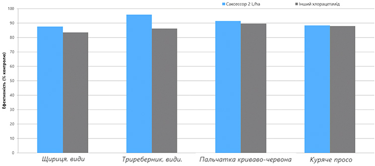 Гербіцид Саксессор™ цікавий насамперед спектром дії, який поєднує в собі особливості інших хлорацетамідів і в дечому їх перевершує. Наприклад, забезпечує контроль гірчиці польової, яка слабко контролюється іншими сполуками цієї групи. Препарат контролює як ярі види бур’янів, так і ті, що переважають у посівах озимих культур, тому є актуальним і для захисту озимого ріпаку. До чутливих бур’янів належать амброзія полинолиста, види герані, горошок мишачий, куряче просо, лобода біла, види мишію, нетреба звичайна, осоти, паслін чорний, види щириці та інші. Щодо більшості бур’янів Саксессор™ забезпечує на кілька відсотків кращий контроль, ніж інші хлорацетаміди.