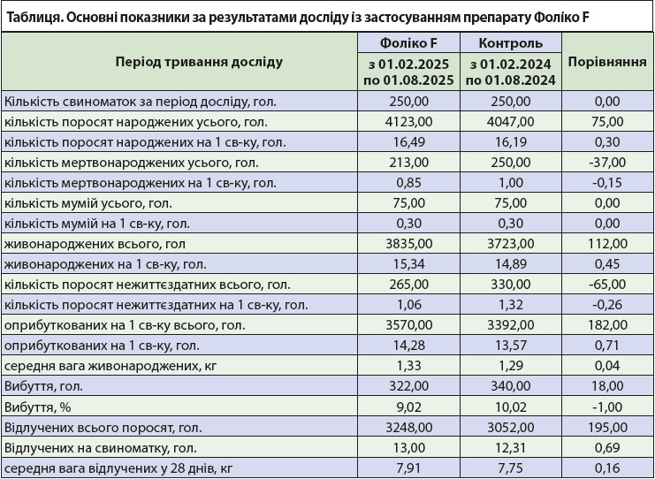 Дослід тривав із лютого по липень 2025 року. У ньому взяли участь 250 клінічно здорових свиноматок, об’єднаних у групи по 10 голів. Фоліко F упродовж усієї супоросності додавали в комбікорм із розрахунку 2 кг на тонну. Результати порівнювали з контрольними показниками 2024 року.