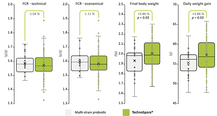 Продуктивність птиці покращилася завдяки використанню TechnoSpore®. Коефіцієнти конверсії корму, як технічний (на основі кінцевої ваги тіла), так і економічний (на основі ваги туші), знизилися завдяки додаванню TechnoSpore®, що підкреслює здатність цього продукту покращувати використання поживних речовин (рис. 1). Крім того, збільшення кінцевої ваги тіла та добового приросту ваги були статистично значущими у птахів, яким додавали TechnoSpore® (p = 0,03).
