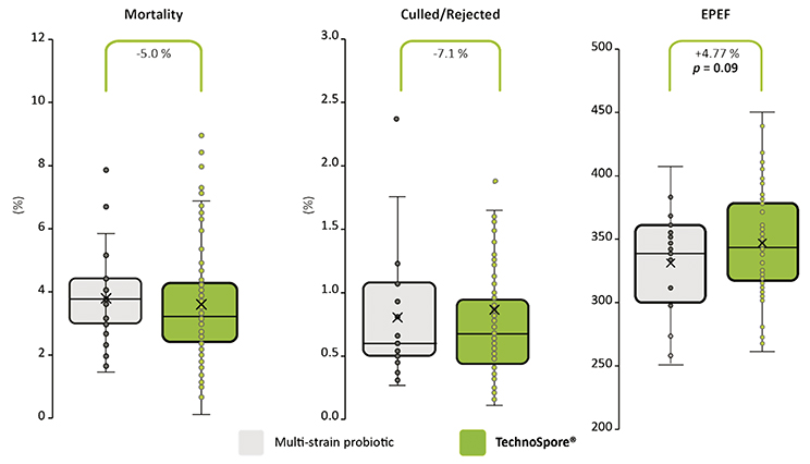 У птиці, якій згодовували TechnoSpore®, смертність була нижчою на 5% та кількість відбракованих та/або вибракуваних птахів зменшилася на 7,1% (рис. 2). Крім того, аналіз отриманих даних показав, що показник Європейського коефіцієнта ефективності виробництва (EPEF) зріс більш ніж на 4,7% завдяки використанню TechnoSpore®, маючи тенденцію до статистичної значущості (p = 0,09; рис. 2). EPEF можна використовувати для порівняння результатів вирощування бройлерів з різних стад і регіонів. Цей коефіцієнт стандартизує технічні показники, зважаючи на конверсію корму, рівень смертності і середньодобовий приріст.