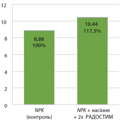 Урожай на контрольній ділянці за повноцінної системи живлення й захисту становив 8,88 т/га. Дослід із застосуванням біостимулятора Радостим, з обробкою насіння й фоліарним підживленням рослин, сформував додаткові 1,56 т/га — 10,44 т, або плюс 17,55% (рис. 1).