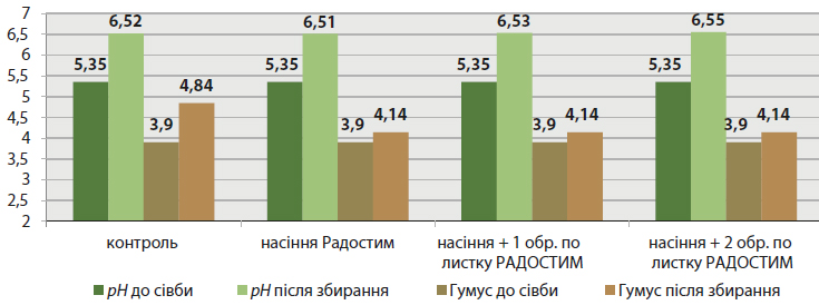 Цікаво було проаналізувати основні показники формування врожаю до та після вирощування промислової культури. Нижче наведено дані рН, гумусу, мінерального азоту, фосфору, калію й кальцію. Що стосується основних показників ґрунту, то рН змінився з 5,35 (кислий) до слабокислого на контролі 6,52 та майже нейтрального 6,55 у досліді. На показники гумусу біостимулятор не вплинув, тому що відновлення органічної речовини, а поготів гумусу, — це досить тривалий період (рис. 2).