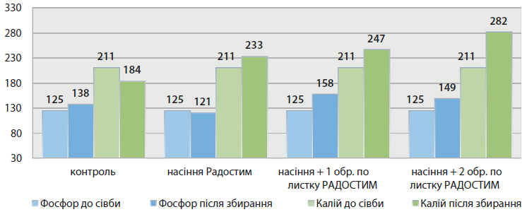 Застосування біостимуляторів вплинуло на незначне підвищення вмісту в ґрунті доступного фосфору та калію — до 10–12% (рис. 3).