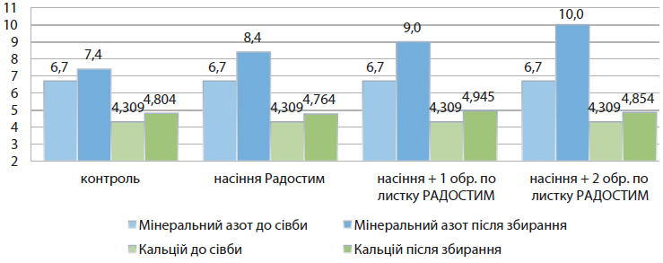 Цікаві результати показав мінеральний азот (збільшення на 35%, з 7,4 в контролі до 10,00 у досліді) а кальцій показав незначне підвищення показників в порівнянні з контролем. (рис. 4).