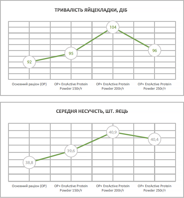 Додавання EnzActive Protein Powder у раціон гусей позитивно вплинуло на низку показників. У дослідних групах тривалість яйцекладки була довшою (від 95 до 104 діб), як порівняти з контрольною (92 доби), що свідчить про потенційне пролонгування репродуктивного періоду. Середня несучість також підвищилась: у групі, яка до раціону отримувала додатково EnzAсtive Protein Powder 200 г/т, вона сягнула 40,9 шт. яєць, що на 2,1 шт. більше проти контролю (38,8). Водночас покращилися показники товщини та міцності шкаралупи, що є важливими критеріями для інкубації.