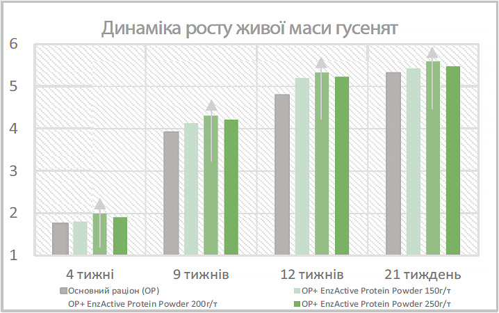 Починаючи з четвертого тижня, у всіх дослідних групах маса тіла перевищувала контроль. Зокрема група, що до раціону отримувала додатково EnzAсtive Protein Powder 200 г/т, мала найвищі показники вже з 4-го тижня (1,99±0,23 кг проти 1,76 ±0,23 кг у контролі, p<0,001), і ця тенденція зберігалася до 21-го тижня: 5,58±0,22 кг проти 5,32±0,18 кг у контролі.