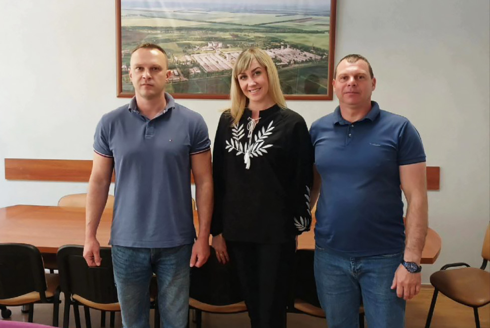 Директор ПрАТ Агрокомбінат Слобожанський, Денис Прокопець (ліворуч) , праворуч — Артем Чернобай, менеджер з організації ефективного використання енергії Агрокомбінату «Слобожанський» та Тетяна Котелевець, менеджерка компанії LEDLIFE з розвитку ринку АПК