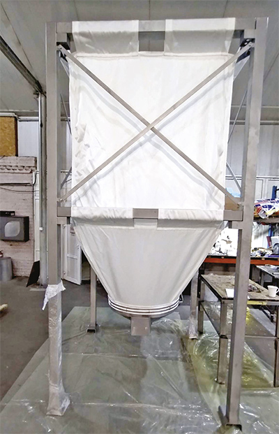 З чого ж складається місткість для безтарного зберігання? Фактично це тканинний мішок із дахом, виготовленим із фільтрувальної тканини для виходу повітря під час завантаження, а також віброднищем із системою вільного обрушення для вивантаження продукту. Місткість оснащено клапаном надлишкового тиску, датчиками рівня, ваговимірювальною системою та шафою керування. Мішок установлюють усередину розбірного каркаса, виготовленого з оцинкованої або неіржавної профільної труби.