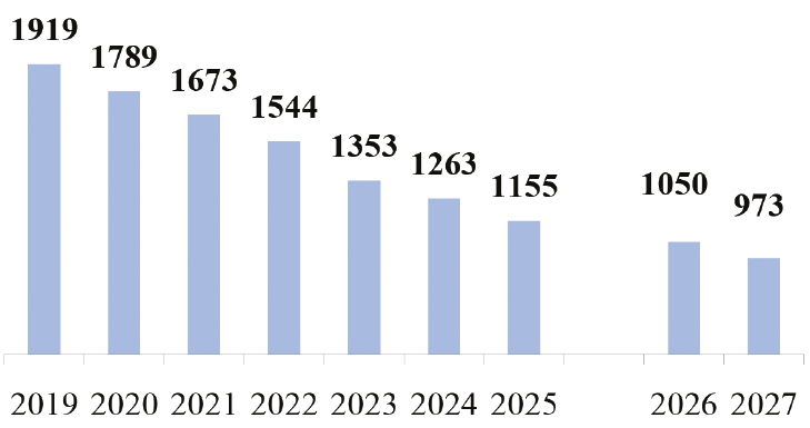 Основа розвитку молочної галузі — молочне скотарство, яке забезпечує молокопереробні підприємства молочною сировиною для виробництва молочних продуктів. На жаль, 2025 року в молочному скотарстві України й далі тривають спадні тренди: скорочується загальне поголів’я молочних корів (очікується, що вже наступного року їхня кількість буде менша за 1 млн голів), знижуються обсяги виробництва молока (цього року валовий надій буде нижчим ніж 7 млн тонн) — 2018 року вони перевищували 10 млн тонн (рис. 1–4).