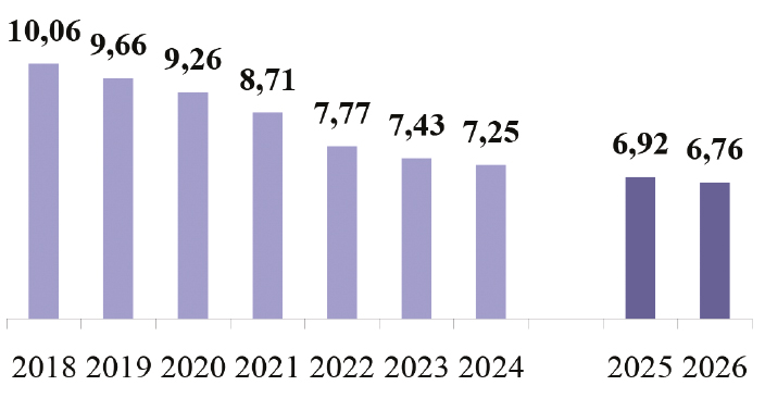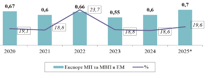 За винятком 2022 року першого року повномасштабної російської військові агресії, для якого характерно суттєве руйнування наявних логістичних схем заготівлі молочної сировини та збуту молочних продуктів, частка молочної сировини, що пройшла етап промислової переробки та була експортована до 2025 року, в середньому не перевищувала 19% (рис. 8). У І півріччі 2025 року вона збільшилась до понад 22,5%, проте, за прогнозами, загалом за 2025 рік вона буде нижчою за 20%.