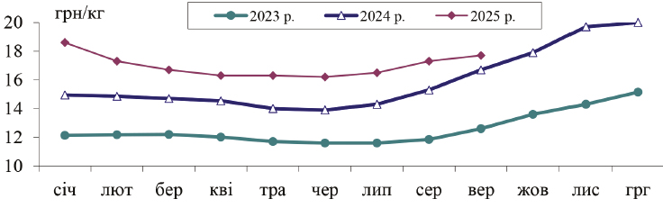 Наявні тренди липня-серпня 2025 року суттєво відрізняються від раніше фіксованих для цього періоду року — нині не спостерігалось зниження обсягів виробництва у найспекотніші місяці року, як це відбувалось у попередні роки, що свідчить про покращення технологій ведення скотарства в сільгосппідприємствах, унаслідок чого практично вдалося усунути вплив сезонного чинника.
