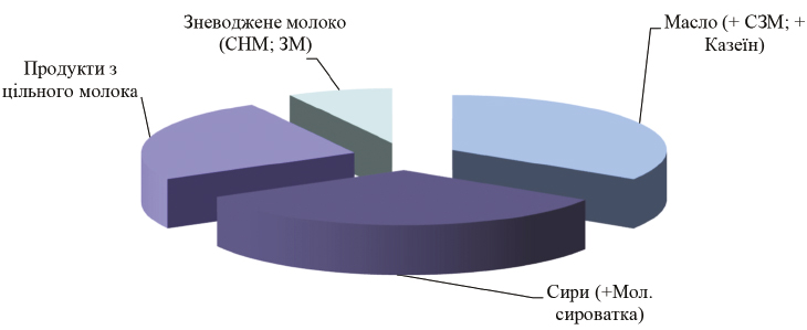 Щодо структури виробництва молокопродуктів (рис. 7), то найбільшу частку молокосировини, що надходить на пром переробку, спрямовують на виробництво масла / молочних жирів (у парі із СЗМ / казеїном) (понад третину), ще майже третину — на виробництво різноманітних сирів (у парі із сироваткою), близько чверті — на продукти із цільного молока (без його зневоднення), залишок (7–8%) — на виробництво продуктів на основі зневоднення цільного молока (СНМ, згущеного молока тощо).