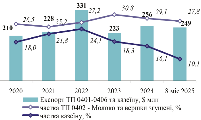 У структурі загального експорту молокопродуктів (з урахуванням казеїну) з України за вісім місяців 2025 року перше місце посідає ТП 0405 — Масло / молочні жири (майже третину). Ще майже 30% — ТП 0402 — Сухе та згущене молоко. Натомість ТП 0406 — Сири усіх видів мають менше як 20% у загальних обсягах експорту, казеїн — всього близько 10% (обсяги його експорту, а відповідно і частка 2025 року, суттєво знизились).