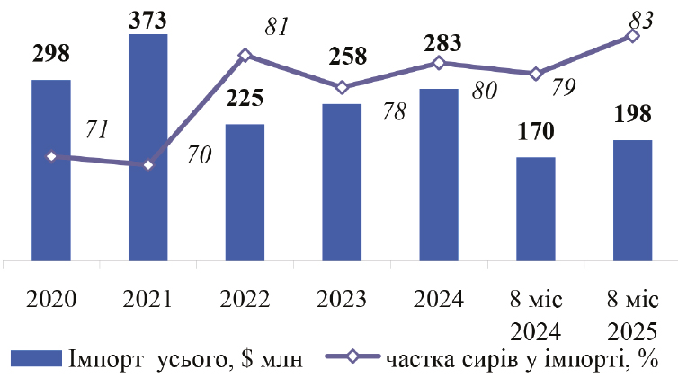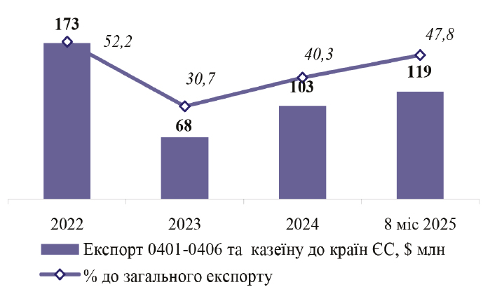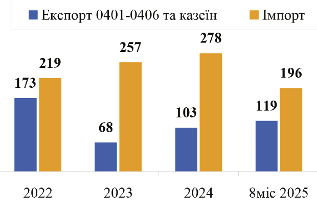 Окремо варто звернути увагу на покращення сальдо зовнішньої торгівлі молокопродуктами (з урахуванням казеїну) з країнами ЄС: якщо 2023 року обсяги імпорту в 3,8 раза перевищували обсяги експорту, то 2024 року зазначене співвідношення знизилось до 2,7 раза, за вісім місяців 2025 року — до 1,7.