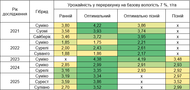 Таблиця 1. Урожайність гібридів соняшнику залежно від терміну посіву, Біла Церква, 2021–2025 рр.