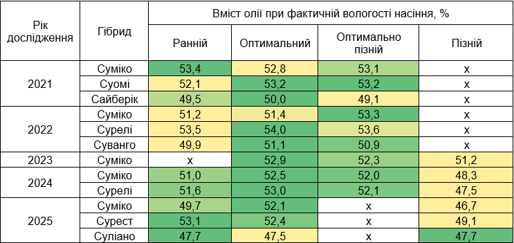 Таблиця 2. Показники вмісту олії в насінні гібридів соняшнику залежно від терміну посіву, Біла Церква, 2021–2025 рр.