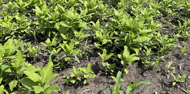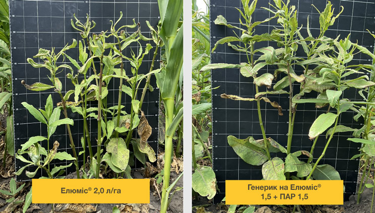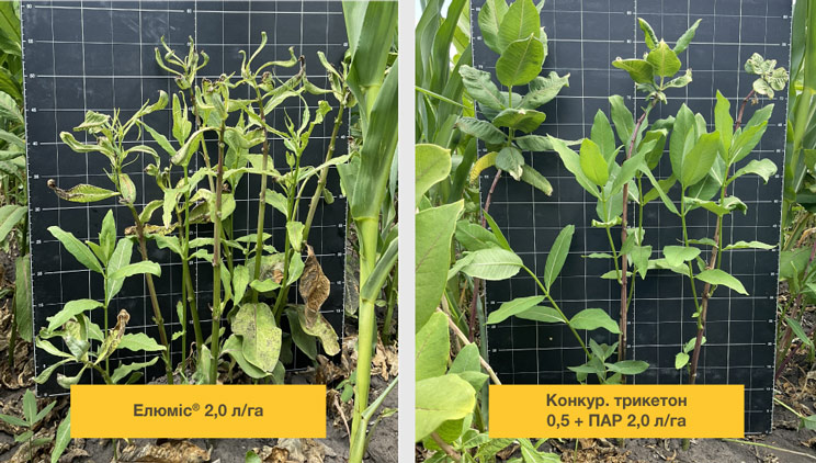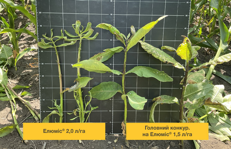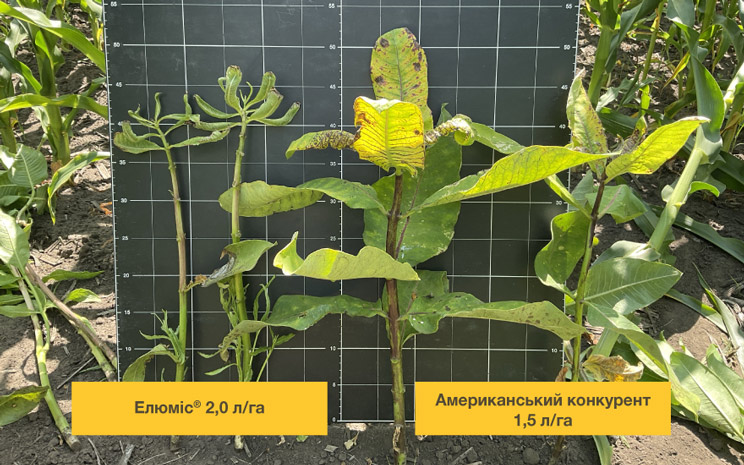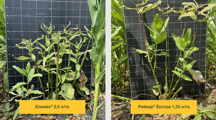 На рис. 9 продемонстровано порівняння контролю бур’яну гербіцидами Елюміс® та Рейкер® Екстра. Після Елюміс® ваточник залишився в нижньому ярусі кукурудзи, не ріс далі, мав стебла, як пружні дроти. Його не було знищено, але при цьому він уже не створював конкуренції для культури до збирання. Ситуація на ділянці з Рейкер® Екстра була приблизно така ж сама, єдине, що ваточник тут почав трохи гілкуватися і спробував відновити вегетацію, хоча до збирання кукурудзи йому також це не вдалося.