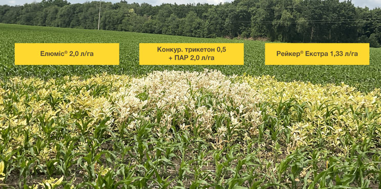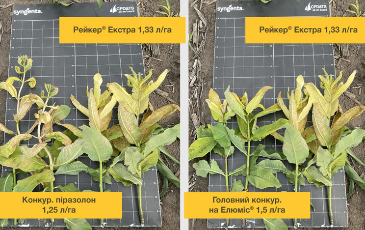 На рис. 7 продемонстровано ефективність конкурентного піразолону та головного конкурента на наш Елюміс® у порівнянні з Рейкер® Екстра. Конкурентний піразолон містить у своєму складі також дикамбу і вбудований сурфактант, але попри це все ріст та розвиток злісної рослини залишаються порівняно більшими. Головний конкурент на Елюміс® — типова трикомпонентна сульфонілсечовина, яка має характерні ознаки, притаманні цим гербіцидам, а саме пригнічення точки росту, яка пожовтіла, але про контроль рослин тут у цілому не йдеться.