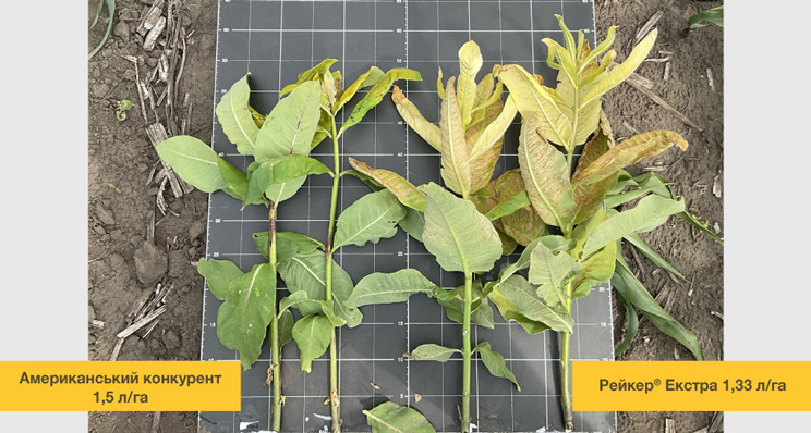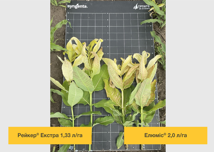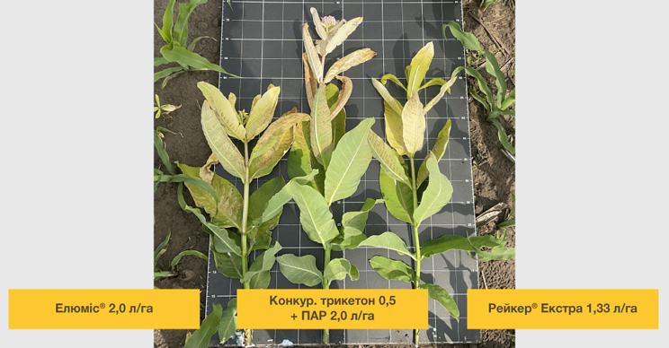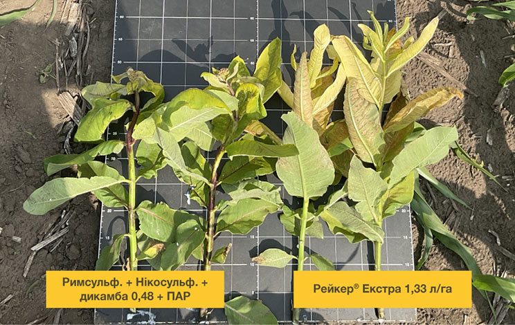 На рис. 6 проведено порівняння трикомпонентного гербіциду на основі римсульфурону + нікосльфурону та дикамби з Рейкер® Екстра на 16 ДПО. Бачимо, що, незважаючи на дикамбу, ваточник трохи пригнічено, є характерні для гормональної складової препарату вигини верхньої частини стебла, але при цьому після Рейкер® Екстра контроль виглядає значно краще.