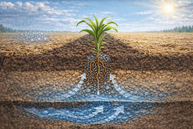 Завдяки такій системі дощова вода швидше потрапляє в зону кореневої системи та краще зберігається в нижніх шарах. Локальне внесення добрив у розпушену смугу забезпечує їх швидке розчинення та доступність для рослин на ранніх етапах розвитку. Це зміцнює кореневу систему, роблячи посіви стійкішими до посухи чи заморозків.