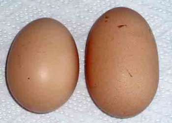 Часто великі за масою інкубаційні яйця містять два чи три жовтки. Зазвичай двожовткові яйця більші за масою, ніж яйця модального класу. Та навіть у яйцях модального класу чи незначно більших за масою виявляють два жовтки (на фото).